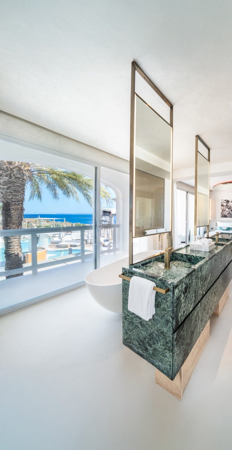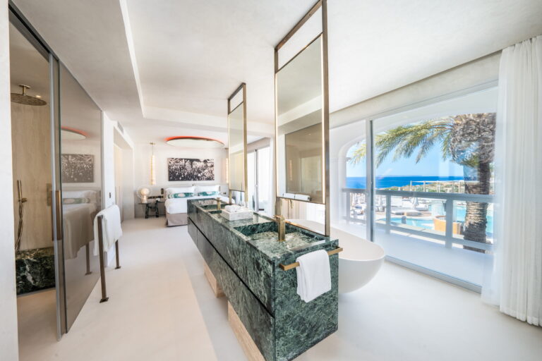 Immerse yourself in villa-style living, surrounded by lush trees and vibrant gardens, where expansive windows seamlessly blend the indoors with the outdoors. From terrace rooms with lush gardens to your own cherry-inspired private pool hideaway, Destino Five Ibiza is designed for the bohemian soul, reveling in 5-star luxury. Every detail has been thoughtfully curated, preserving a sleek, timeless design that offers a tranquil, zen-like retreat within your room, just steps from the pulse of Ibiza’s