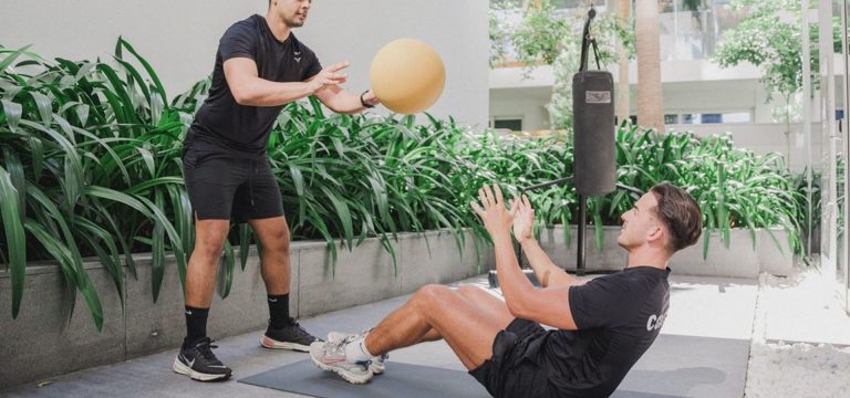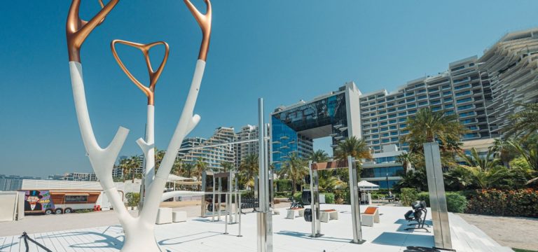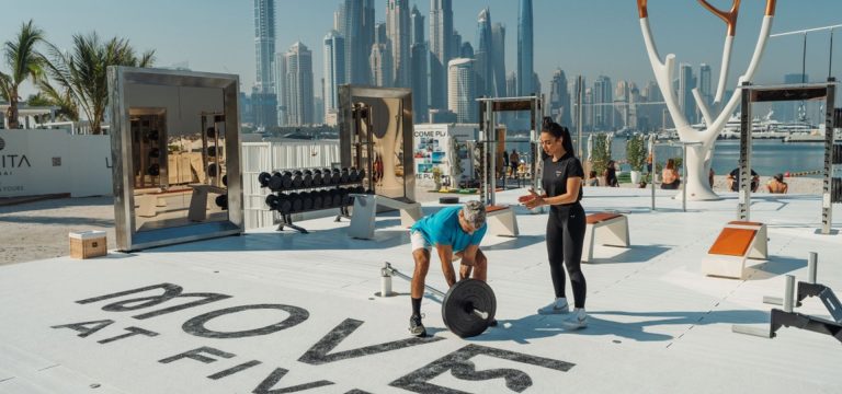 Lift, sweat, repeat on the beach with a Dubai Marina skyline backdrop.